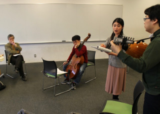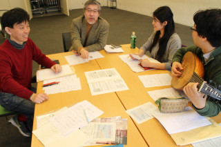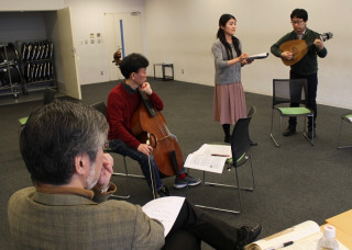 講師の河合祥一郎さんを中心に、 ヴィオラ・ダ・ガンバの中山真一さん、 リュートの坂本龍右さん、 ソプラノ歌手の佐藤裕希恵さん。 リコーダーの太田光子さんは、 今日はお休みでした。