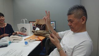 お、ジャケットの下に見えるのは、 カクシンハンのオリジナルTシャツ。 全身で連帯を示しています。 シェイクスピアがつないでくれた 絆ですね。 |