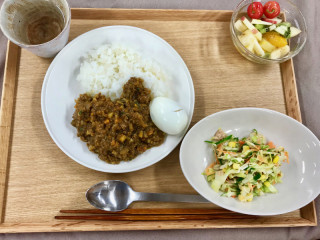 今日は火曜日、給食の日です。 メニューはドライカレーです。 ごぼう、にんじん、れんこん、しそなどが 刻まれて入っていて、 たいっへん、おいしゅうございました!