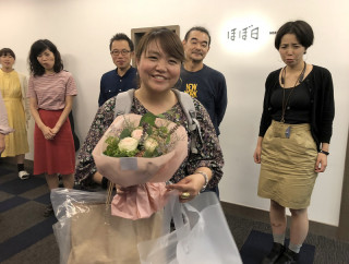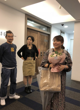 さんから、花束の贈呈があり、 そのまま、ほぼ日最終日恒例の、 エレベーターホールでのお見送りに。 あれ、肝心のチームリーダーの さんは?