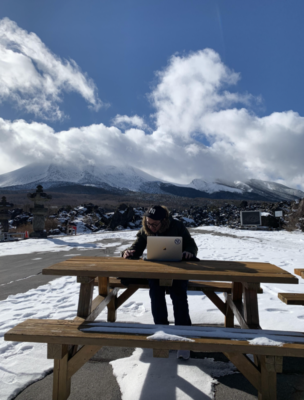 じつはお正月に、ちょこっと平本くんと、 予定していた時刻に パソコン上で連絡を取り合った際に、 (2枚めの)写真のような状況なう、と 報告してくれたのでした。 ここが鬼押出し、というわけです。