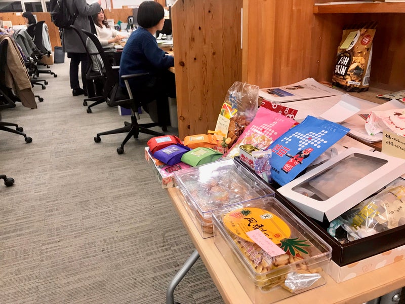 本日は仕事はじめなので、 みんながいろんなおみやげを 持ってきてくれます。 おやつでおなかがいっぱいになっております。