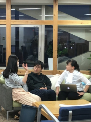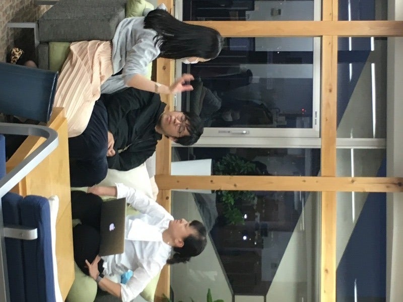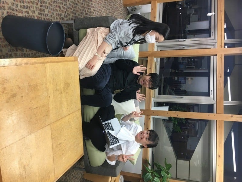 が たしかにぎゅっとくっついて話し込んでいます。 え、こんなに充実したソファーセットの中で あえて一つのソファーに、 三人並んで座って話してるの? 仲良しか!