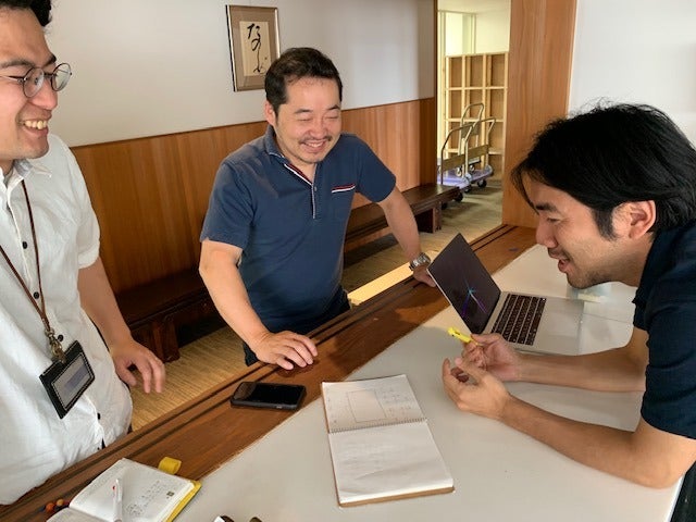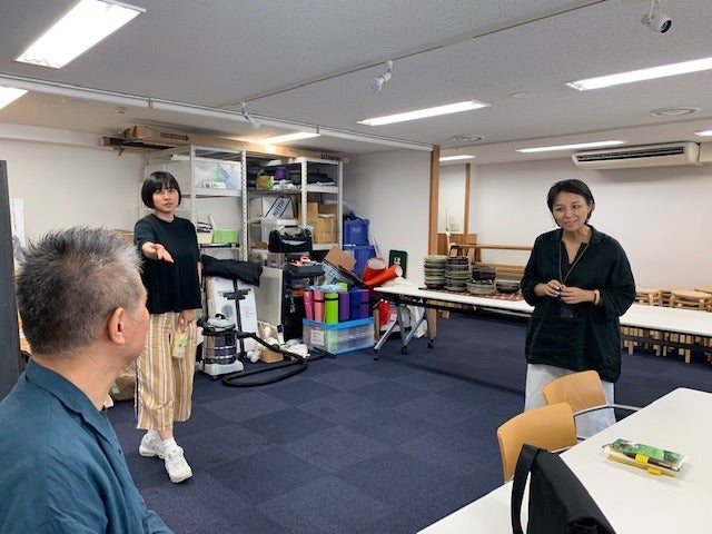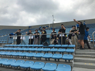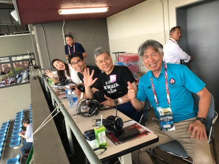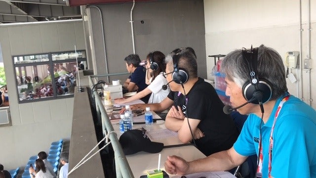まずは試合後に撮る記念撮影のために 会場内で指示を出して調整しています。 カメラ側から電話がかかってきて 「もうちょっと左へ」 「あ、はい。みんな左だってー!」 「糸井さんの場所を確認して」 「はい、じゃあここで看板持ちましょう」 といったやりとりをして準備完了です。