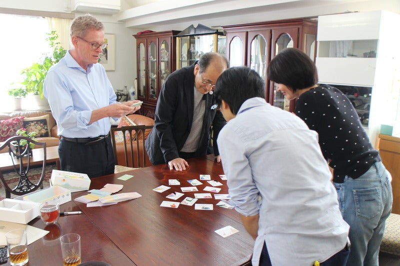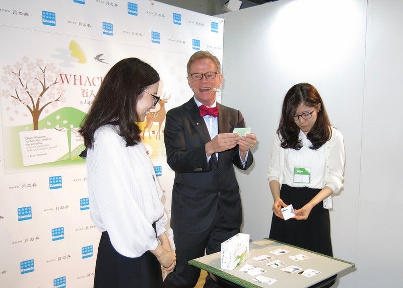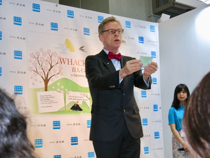 「日本の心が詠みこまれた百人一首は、 日本文化を世界に発信するうえで 最適のものです。 遊びながら自然に日本の心が わかります」と語るマクミランさん。 記者会見でも、5行詩に訳した和歌を 朗々と吟じて披露されました。