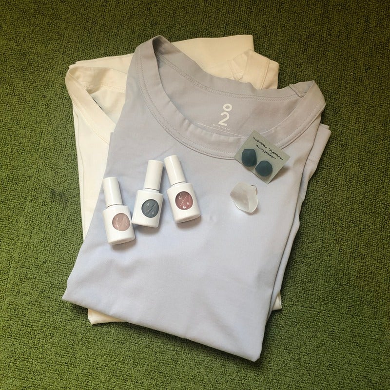また、〈O2〉のTシャツにあう、 ニュアンスカラーがきれいな 「uka(ウカ)」のマニキュア、 色使いと涼しけな質感がかわいい 「nemunemu」のアクセサリーも。