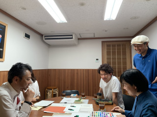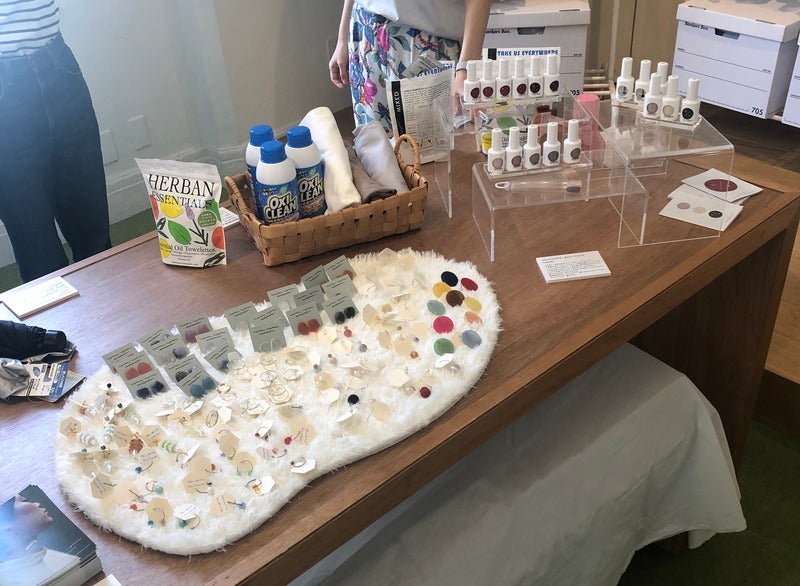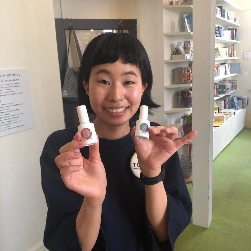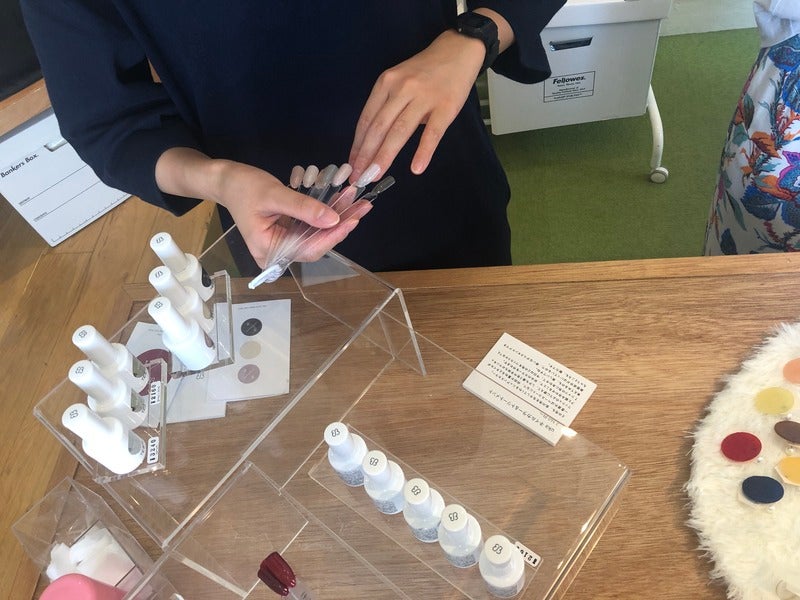「uka」のマニキュアは、 華やかな色使いではなく、 どれも淡い、ニュアンスのあるカラー。 肌の色がきれいに見える色をえらぶと、 指先だけでなく 手元もきれいに見えるんですって。 さっそくわたしたちも、 どれが合うかな〜、と チップをあててみました。 (この作業も、たのしい!)
