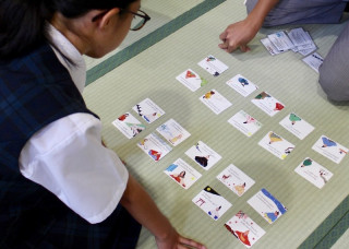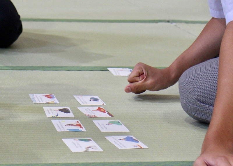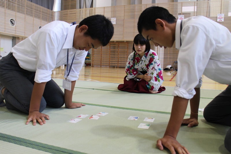 ほぼ日の学校万葉集講座で 講師を務めてくださった 詩人のピーター・マクミランさんが翻訳作成した 世界初の英語百人一首かるたを使って、 中学生たちが競技かるたに挑戦しました。