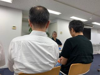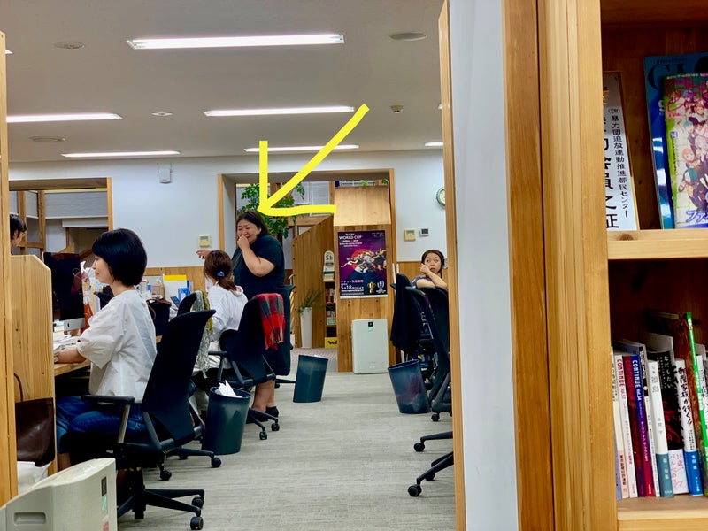 15分ほど前から、 が 「電源ありませんか、電源ありませんか、 今日どうしてもやらなきゃいけない 仕事があって、 電源ケーブルの調子が悪かったんですけど、 充電ぶんでやりきれるとふんで、 がんばっていたんです。 あと1行で完成する、という段階になって バッテリーがプーーーンとなくなってしまいました。 というわけで、ACアダプターをお持ちの方を ものすごく探しているんです!」 といって、白い目をしてうろうろしていました。