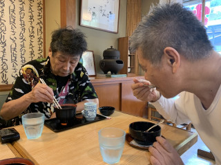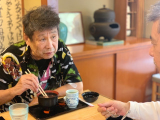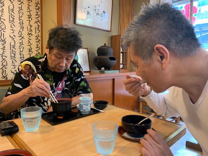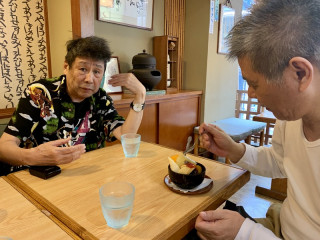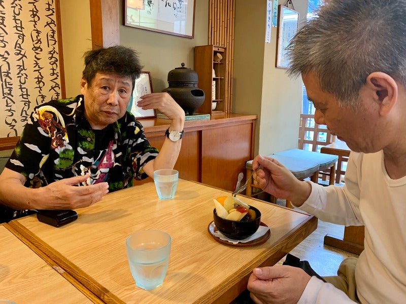旅の最中、横尾さんは 「ここにはぜんざいはないの?」 「あしたの朝食にぜんざいは出ないの?」 「ぜんざい屋さんがないならぼくは あの店でおはぎを買う」 と言い続けられましたので、 箱根湯本駅で私がキップを買っている間に、 糸井重里が、その類稀なる、 甘味シェルパとしての力を発揮し、 「たしか駅前のあの2階あたりに 甘味処がある気がする!」 と合宿一同を誘導、 みごと横尾さんは「ぜんざい」に ありつけたのでした。