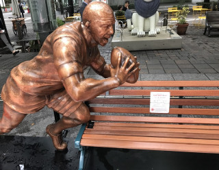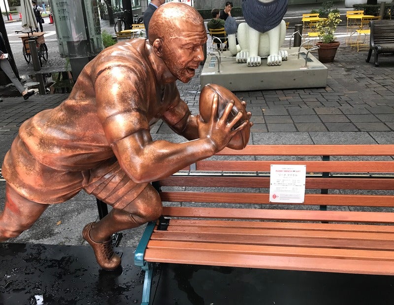 そして、にわかのみなさん、 丸ビルの外には、 リーチマイケル選手のベンチが できていました。 これはかなりのフォトスポットです! |