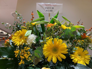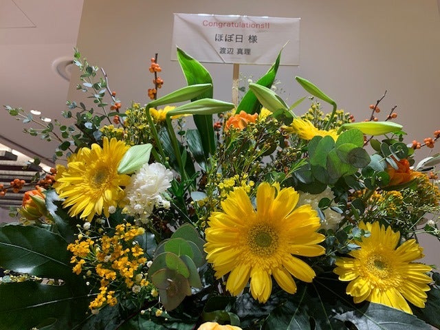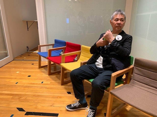 「ほぼ日曜日」のトレードマークにもなっているカラフルなイスでひと休み。あ、渡辺真理さんからのお花も届いてます。ありがとうございます!