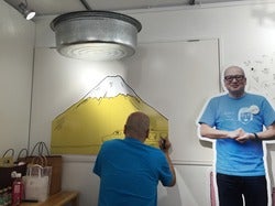 描いてくださった黄色い富士山の前、