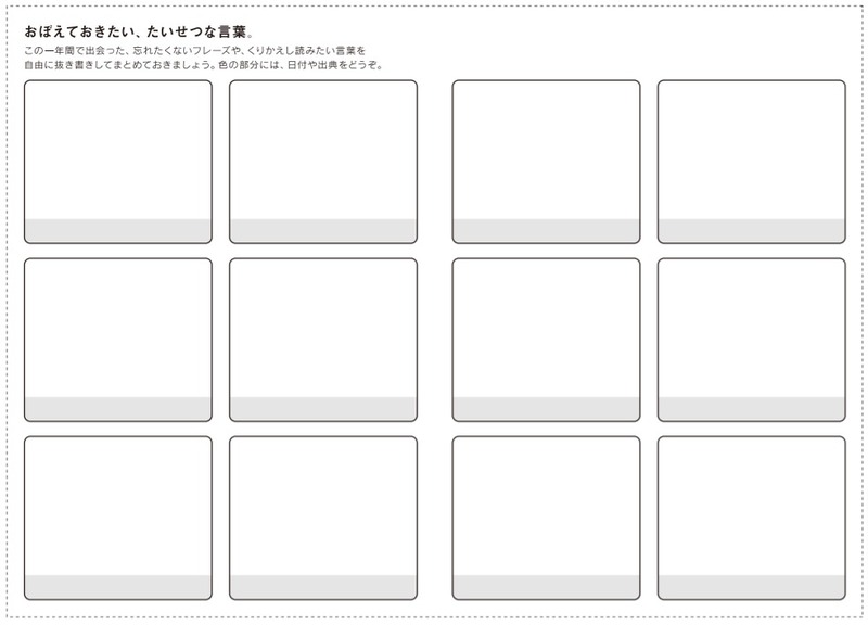 This page allows you to write down important words and phrases you've encountered throughout the year to occasionally look back on. Use the gray area of each block to write down dates or sources.