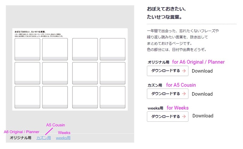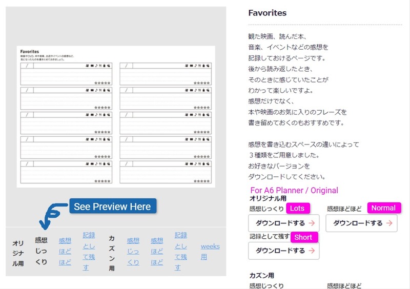 I've roughly annotated the Japanese here. You can see a preview of what you'll be downloading by clicking on each size of the gray box on the left. You can download by clicking on "Download" with the pink arrow on the right. This is the same for all other pages!