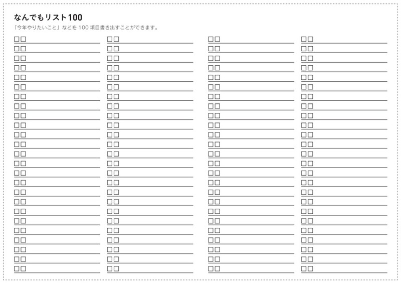 Here is a list where you can write down 100 things, whether they be things you want to accomplosh this year, movies you'd like to watch or places you'd like to visit at least once in your life. You can tick off things you've accomplished using the check box. If 100 is a bit much for you, there's also a version with just 50 lines.