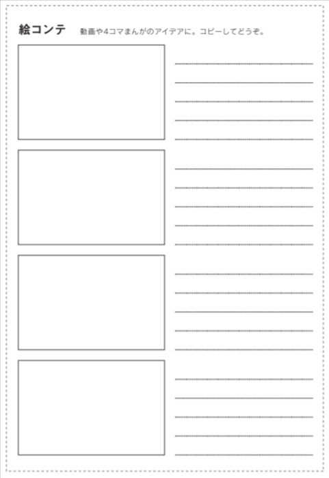 This sheet is a storyboard for 4 frames. Draw four frame comic strips, use it to come up with a storyline or convey an idea you've come up with with someone else. You can also paste a photo in the frame and write down a text to acompany it on the right.