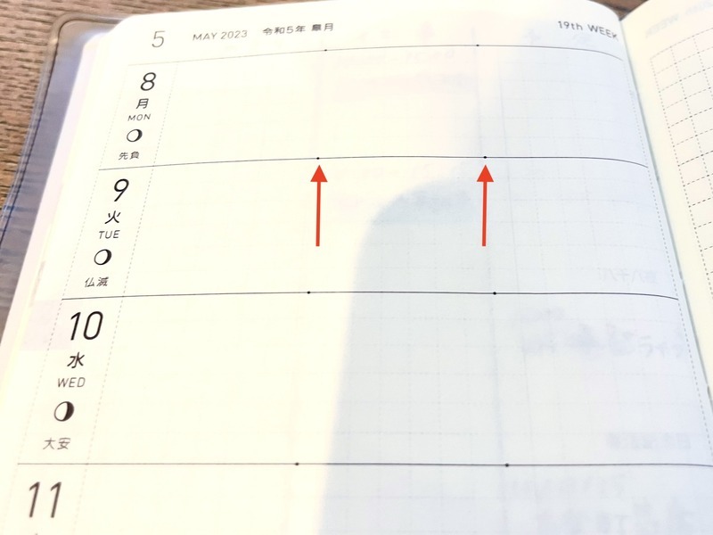 These tiny dots are so subtle that you can write on the page without thinking about them. However, they would come in handy if you use the dots as guides for dividing the day in a rough 2:1 ratio, or to draw a solid line and split the day into three parts.
