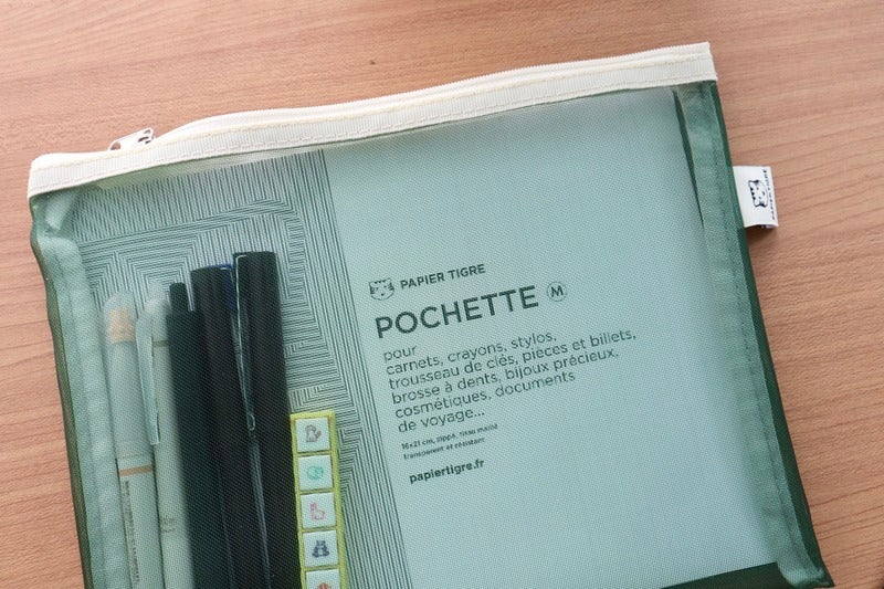 Let me share two more items. The PAPIER TIGRE mesh pocket and elastic pen holder are the ones that I bought at the beginning of this year for the HON book, as I was planning to use them for work this year. PAPIER TIGRE is a Parisian brand, and I am fascinated with their use of color.
