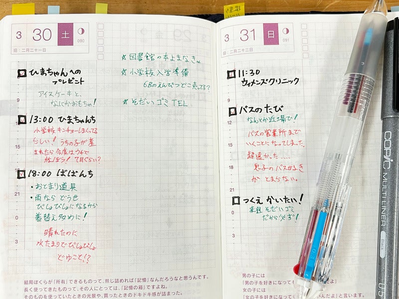 I use multi-colored pens for the compact Weeks book so that I can carry only a few pens with it.