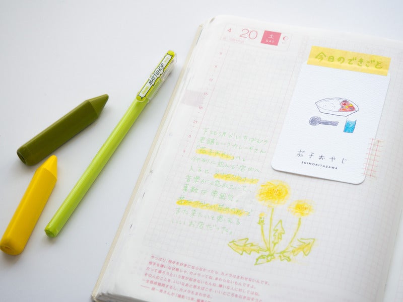 I found a dandelion while I was on a walk and kept it for my diary. By drawing a matching yellow line to the corresponding words, the page feels more organized.