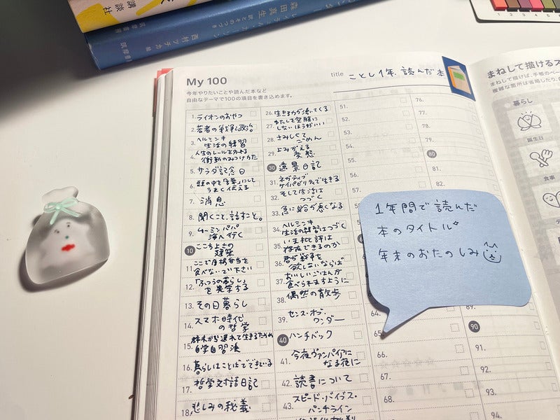 Every year, something I really look forward to is copying all of those titles from the monthly calendar into the My 100 list in the bonus pages at the back. It’s such a happy ritual for me. After a year passes, the contents of the books I read at the start have waned a little. Writing the title one more time reminds me of little things about each one like: “Ah, I bought this from that book shop...” or “I remember reading this whilst on holiday!”After flipping back and forth through the pages, I finished listing everything I’ve read so far.
