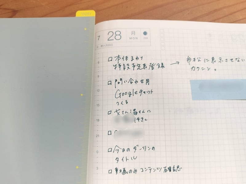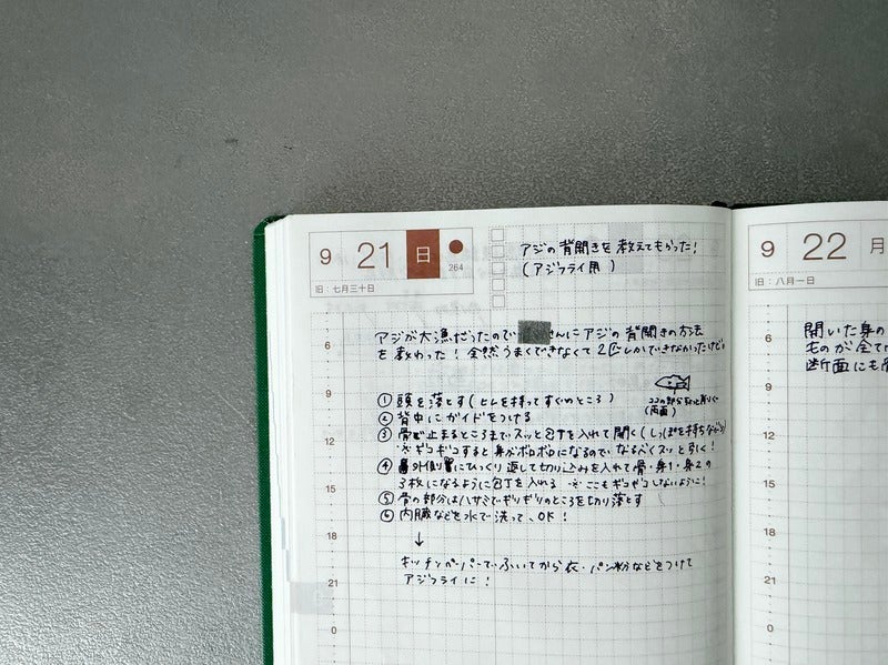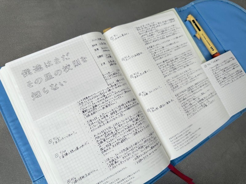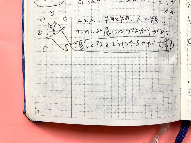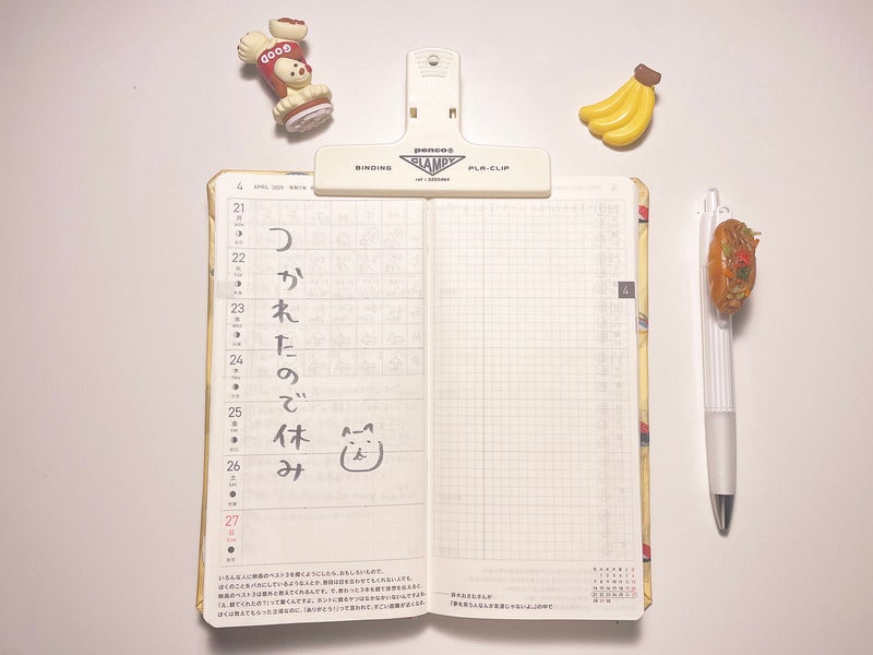 Recently, I’ve been into drawing little illustrations on the left side of the faint “secret vertical line” in the graph paper. They work as handy visual markers when I look back later.