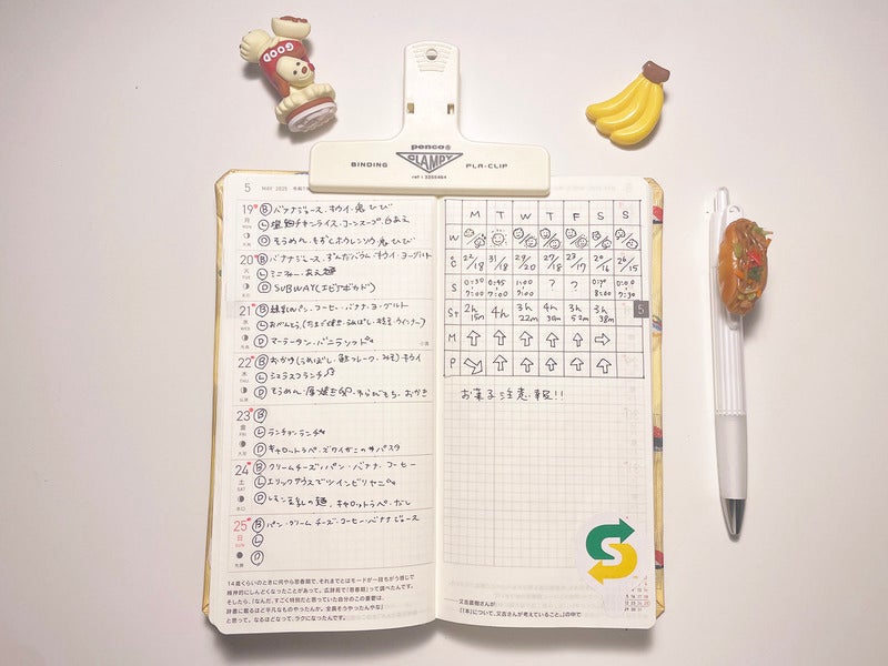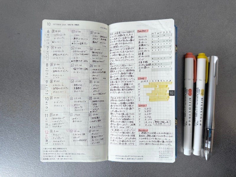 After looking at lots of formats on social media, I finally found a style that fit me this year. On the weekly pages I wrote what I ate; in the memo pages I tracked habits, sleep time, and steps; and at the end of each week, I wrote a short review. Thanks to keeping these logs, I became much more aware of how my body was doing day to day. For example, I noticed I got a small mouth ulcer—and I now know from experience that it fully heals in about six days!