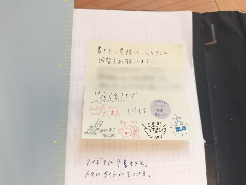 This page shows the signatures people left after checking some of our recent production samples. But hang on—isn’t everyone way too good at drawing? These are way too cute for casual notes. I had to paste them into my techo. And Kawamura’s elegant handwriting... I’m always jealous. Maybe being surrounded by so much handwriting is one of the small blessings of working in the Techo Team.