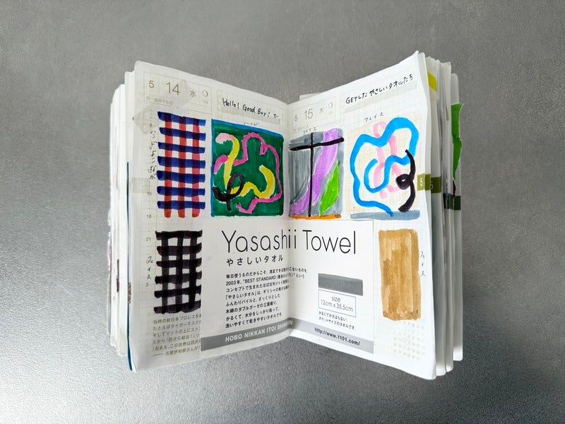 The photo shows a page where I tried drawing the pattern from a Yasashii Towel I bought. The drawing isn’t very good at all, but I had so much fun making it that it’s one of my favorite pages.