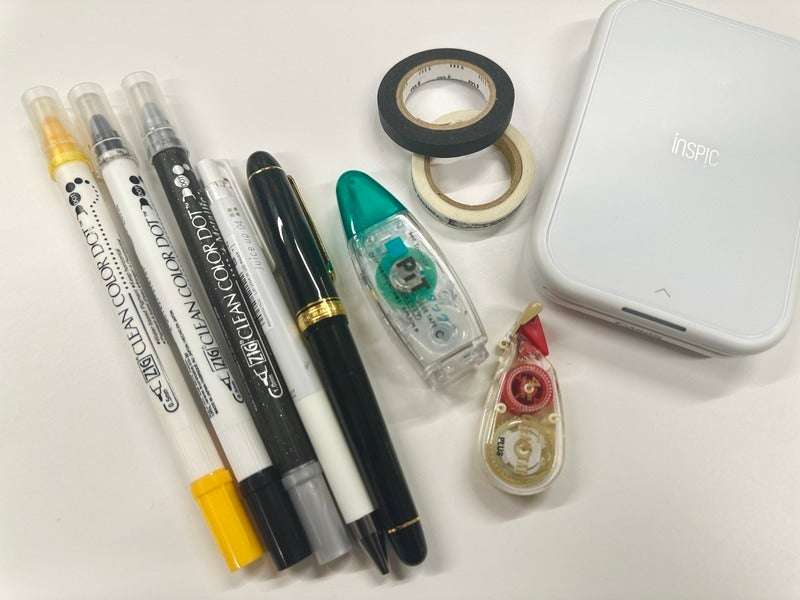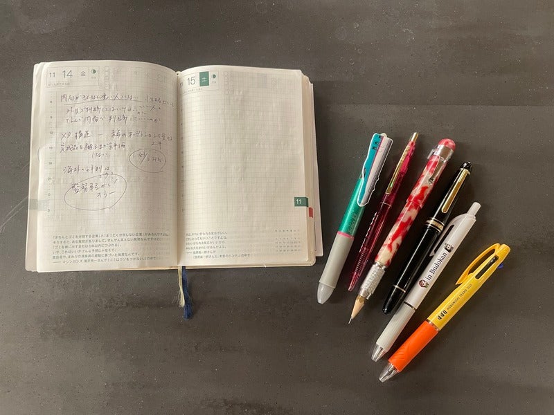 Of course, I also use my phonefs memo app, but one nice thing about a paper planner is that it doesnft show fingerprints. Alongside my most-used pens. Since this is a work techo, weekends tend to stay blank.