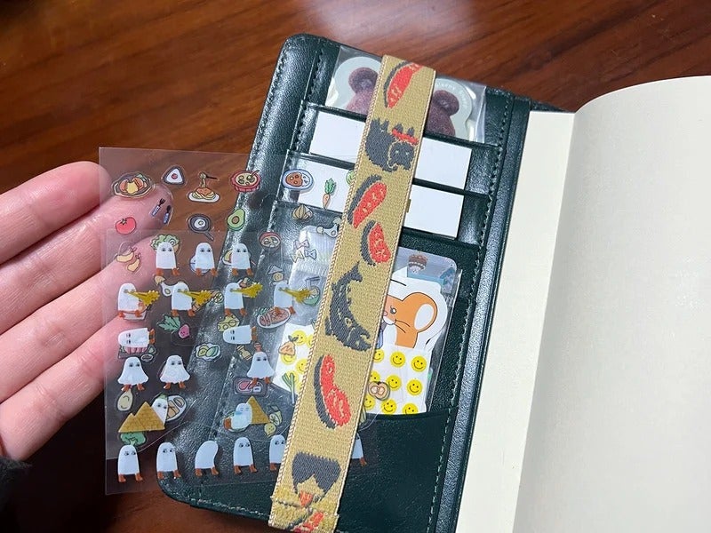 I wrap the band around my techo and use the inside to tuck in stickers that don't quite fit in the pockets.