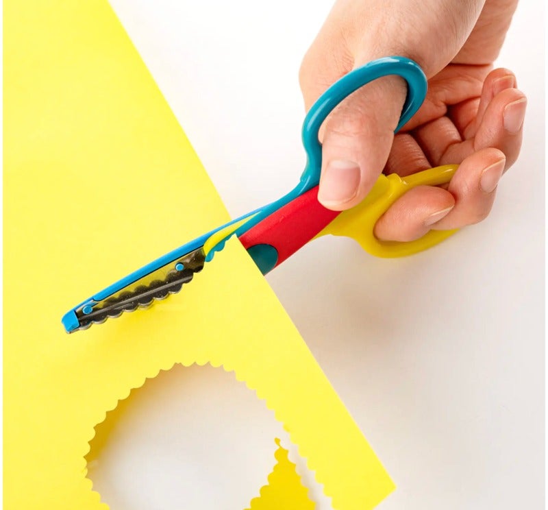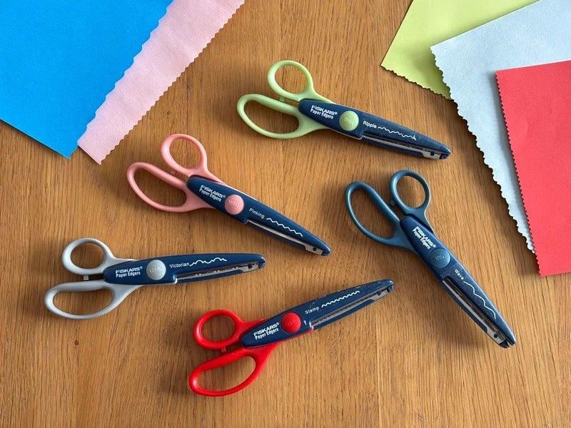 These are gPaper Edgersh by the famous scissor manufacturer Fiskars. The blades are shaped like waves or zig-zags, allowing you to enjoy decorative paper cutting. I found them at a stationery shop about 10 years ago. I fell in love with the beautiful colors and cute shapes, and since I couldn't decide which to get, I ended up buying all five.