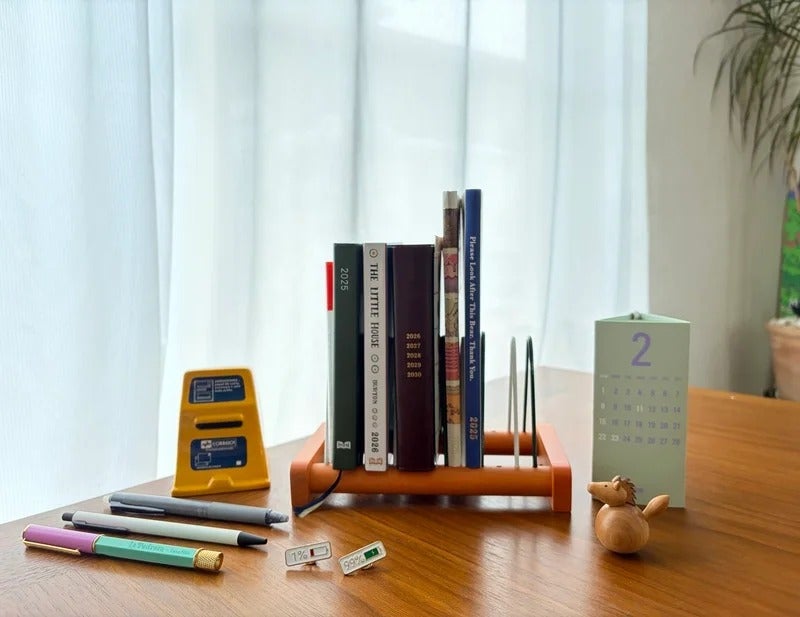 Itfs the perfect home for my techo. It feels more casual and accessible than a bookshelf, because I can keep it somewhere always in sight, and itfs easy to pick up and easy to move around. I use it to line up this yearfs book alongside my techo from last year. The design of the spines really stands out, and just looking at them lifts my spirits!