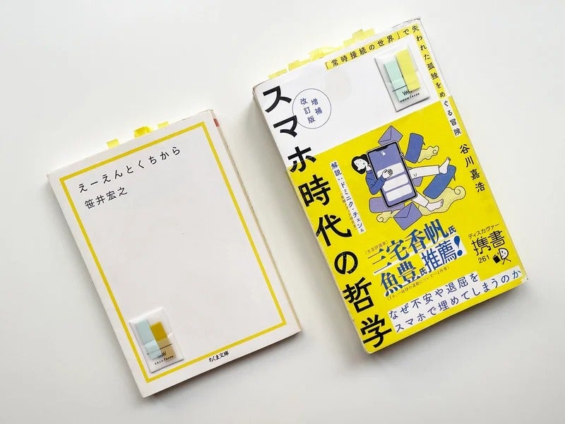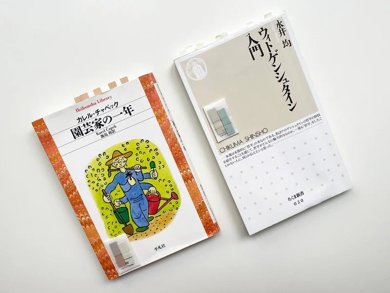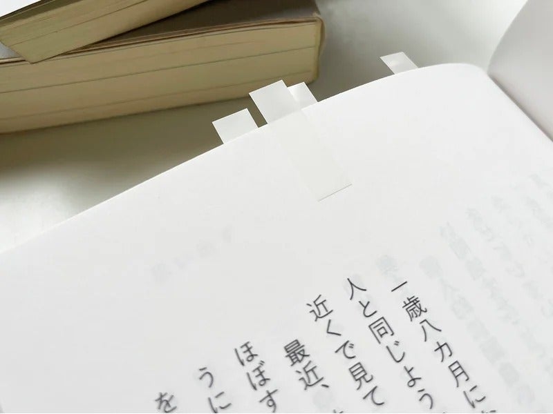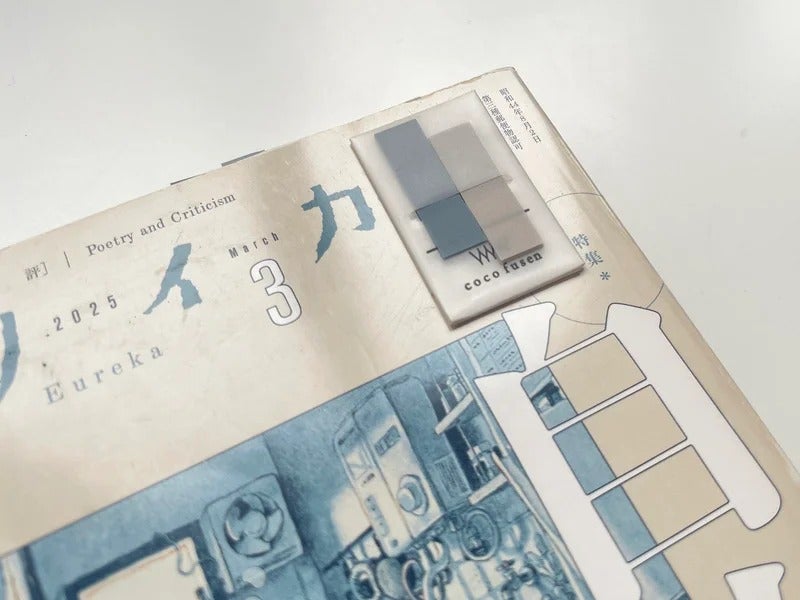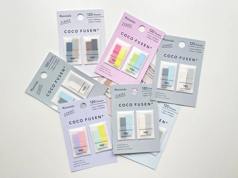 coco fusen is a series of film-based sticky tabs that come pre-set in a small case. The back of the case is made of a material that can be peeled off and reattached, so you can stick it right onto the cover of your book.
