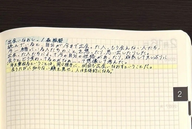 Below that, I write my thoughts. If there was a sentence that particularly resonated with me, Ifll highlight it first and then write the words over the top so that they stand out to me whenever I look back.