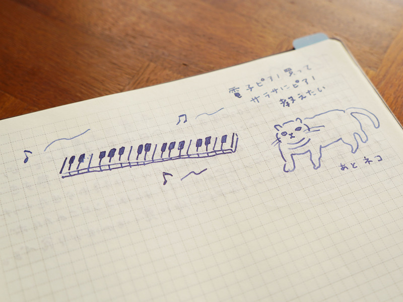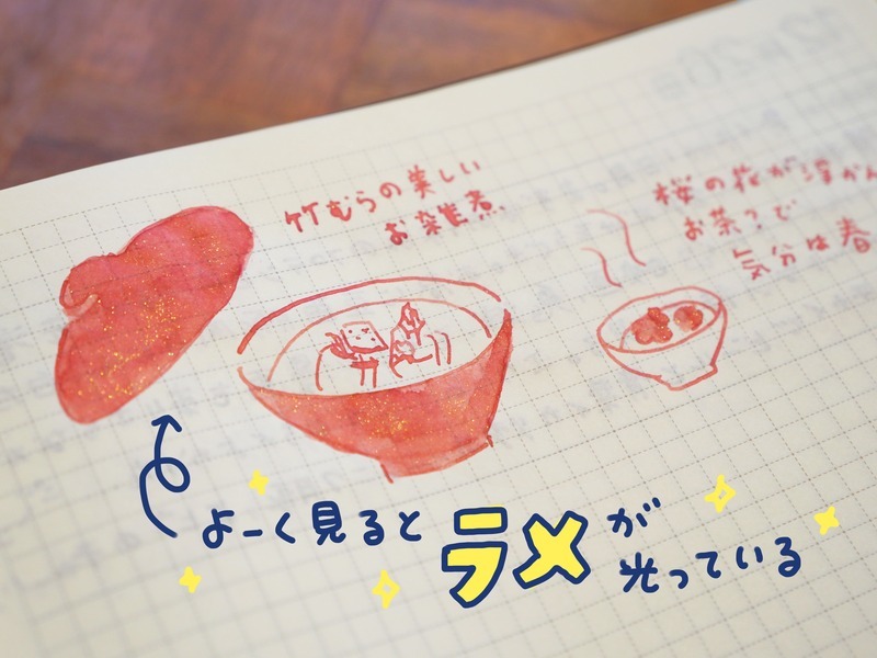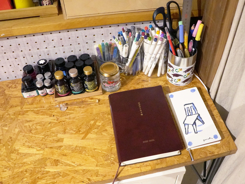 She writes her day's events on the left page, and draws a quick illustration on the right. She used to only write on the left page, but ever since switching to using a glass pen, she felt the urge to write more and decided to draw on the right page! She occasionally uses a brush to color in her drawings too. Annen says that the time spent in choosing an ink color of her choice is a fun one.
