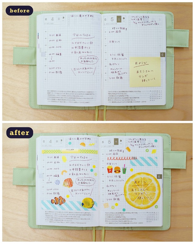 Ever since making these usage examples, I have been on the hunt for cute stickers to paste in my techo. Thatfs the other thing - techofs are a great outlet of pasting your stickers! When I was little, I used to collect lots of stickers and had exchanged my favorite stickers with friends to paste it my sticker notebook (is this a thing in other countries? I tried looking for mine to show you a picture but failed to find itc) but never ended up using them. The rare occasion I did so is when I wrote letters to my friends, but other than that, I felt that they were too precious to use.