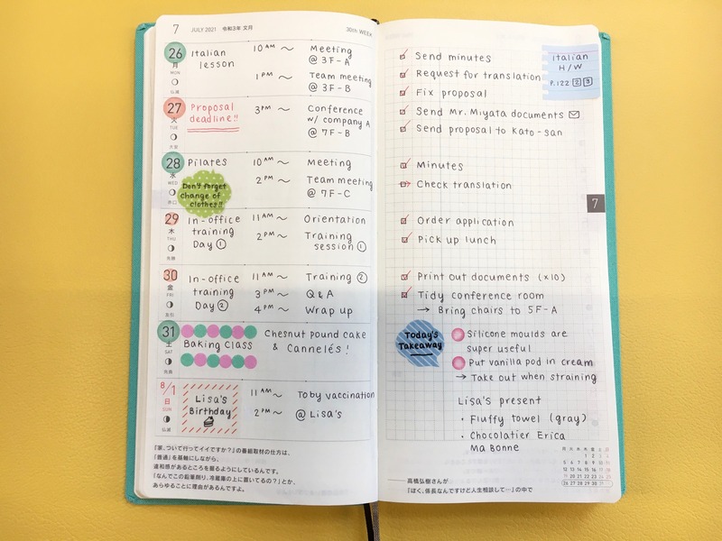 I started out by using a 3-color Jetstream ballpoint pen to fill in my techo. I write down the weekly schedule at the start of the week on the left-hand side, and add the to-do check boxes on the right side as the week progresses. Although it looks clean, I do want to add a bit more color.
