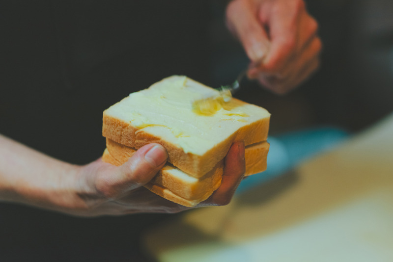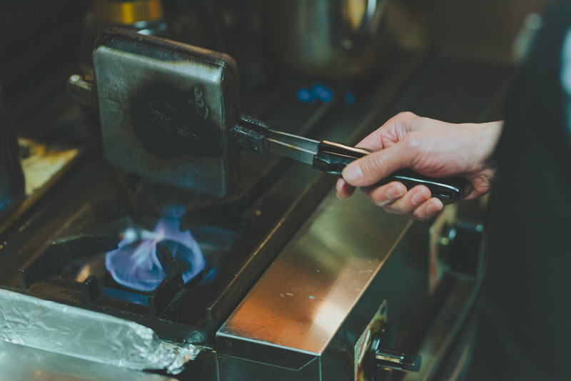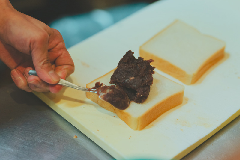 Uses shoku pan (white loaf) from Suzuki Bakery, who they have known each other for over 50 years. Itfs sandwiched with anko (red bean curd) and toasted gradually by adding lots of salted butter. Chief Sasaki came up with this idea.