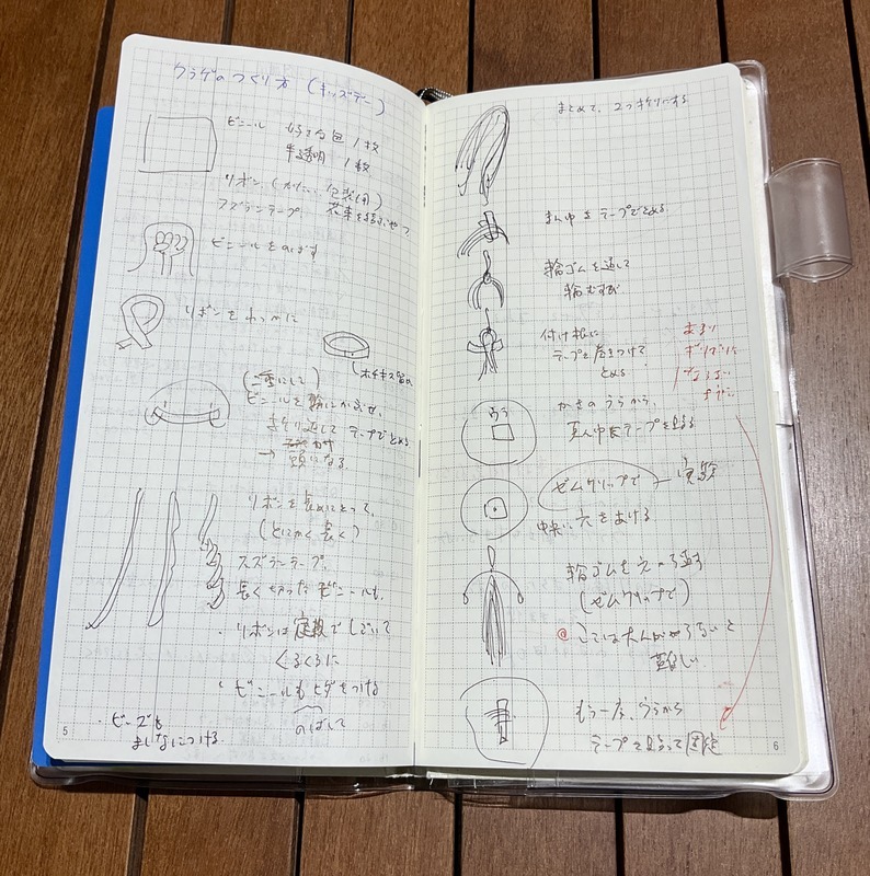 During summer vacation, we held a Kids Day workshop at the office, inviting the children of our crew members. We made handmade jellyfish together. This page shows some rough design sketches. I really do love making things.
