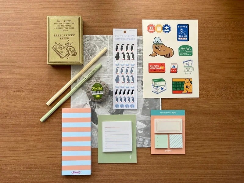 Here they are! These are all items I bought during a trip to South Korea. Clockwise from the top left, we have: label stickers, stickers, more stickers, two types of sticky notes, a memo pad, masking tape, and two types of pencils. I picked these up at several different shops.