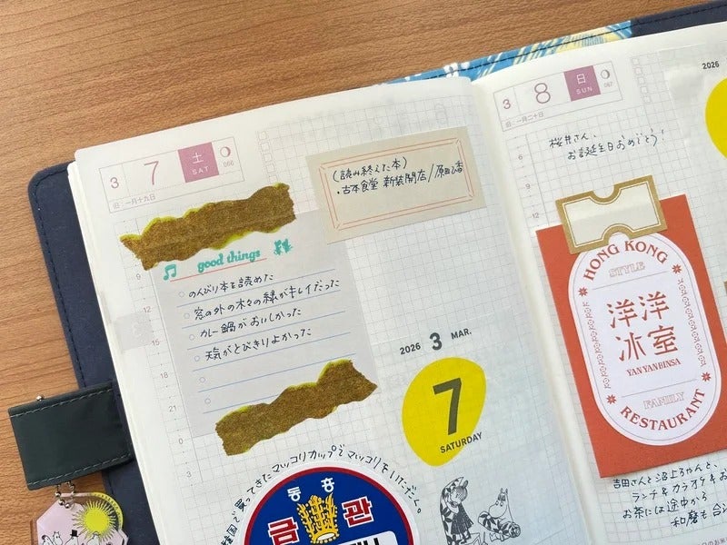 This is a way of using the techo that Ifve been enjoying lately with various sticky note designs: I use them to write down the happy things or "wins" from that day. Even when I donft have much time, just writing these down and pasting them in makes for a page thatfs a joy to read back on. I used the label stickers to attach my shop cards. Ifm really looking forward to finding even more ways to use all these tools.