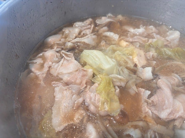 山の上で食べる豚汁ですよ。