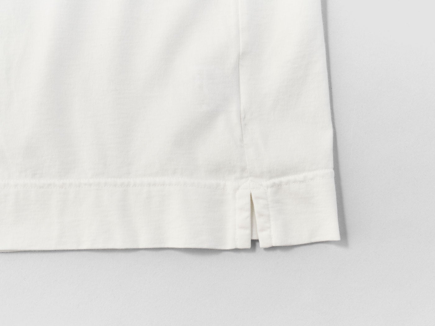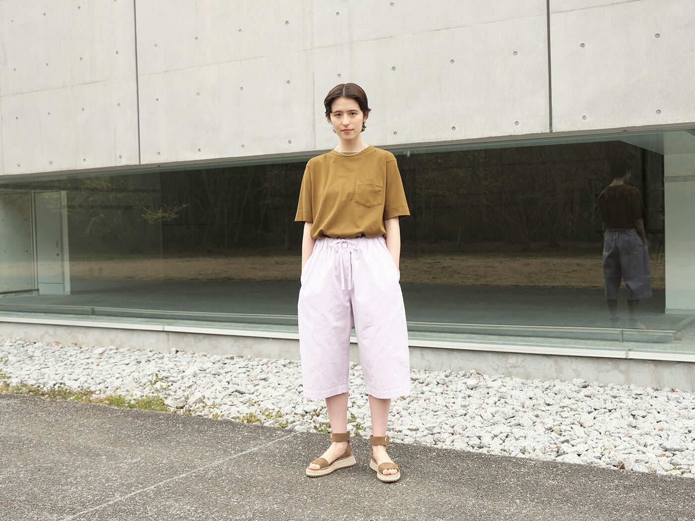 白のパンツをタックインして清潔感のあるスタイルにしました。