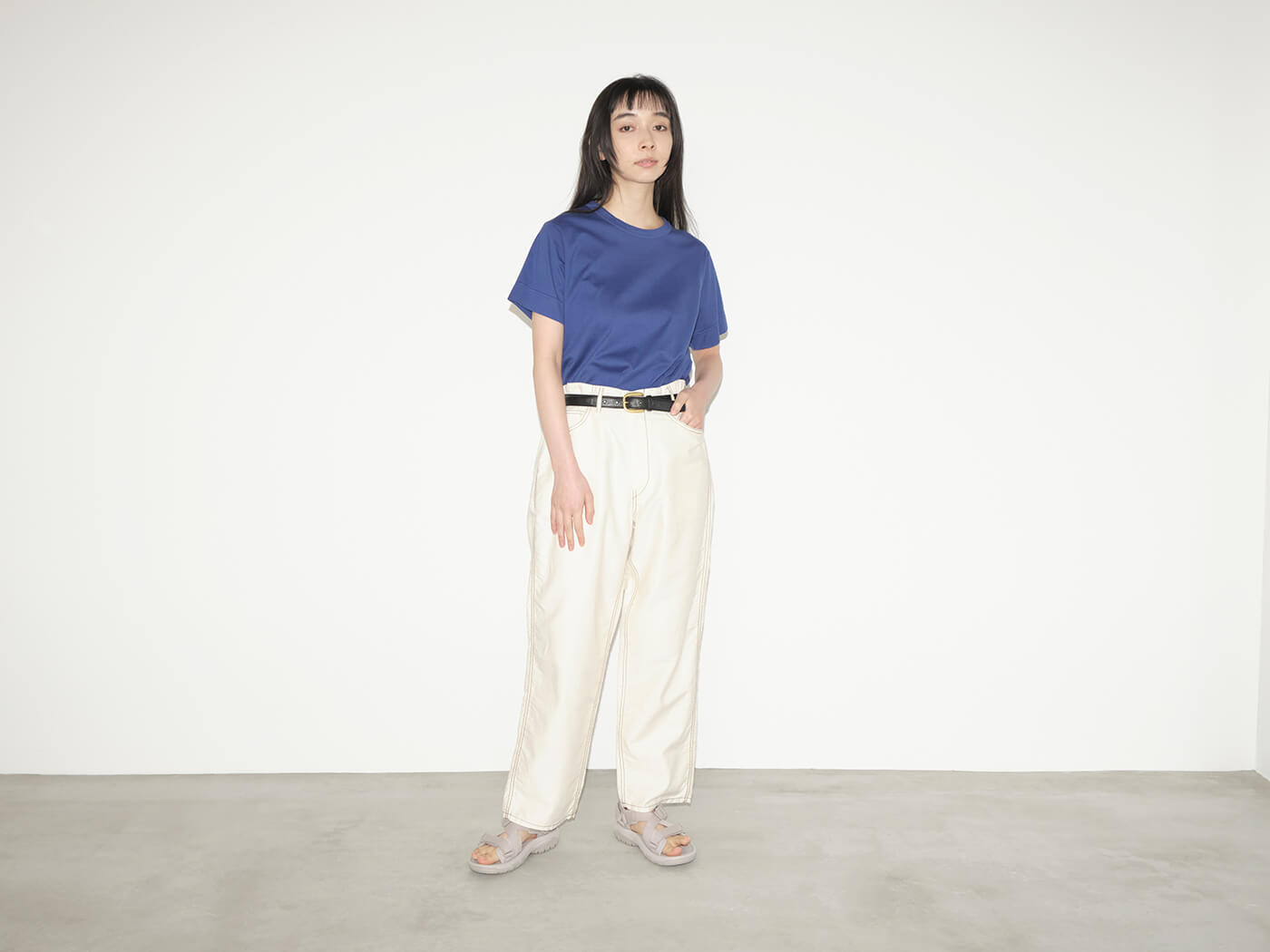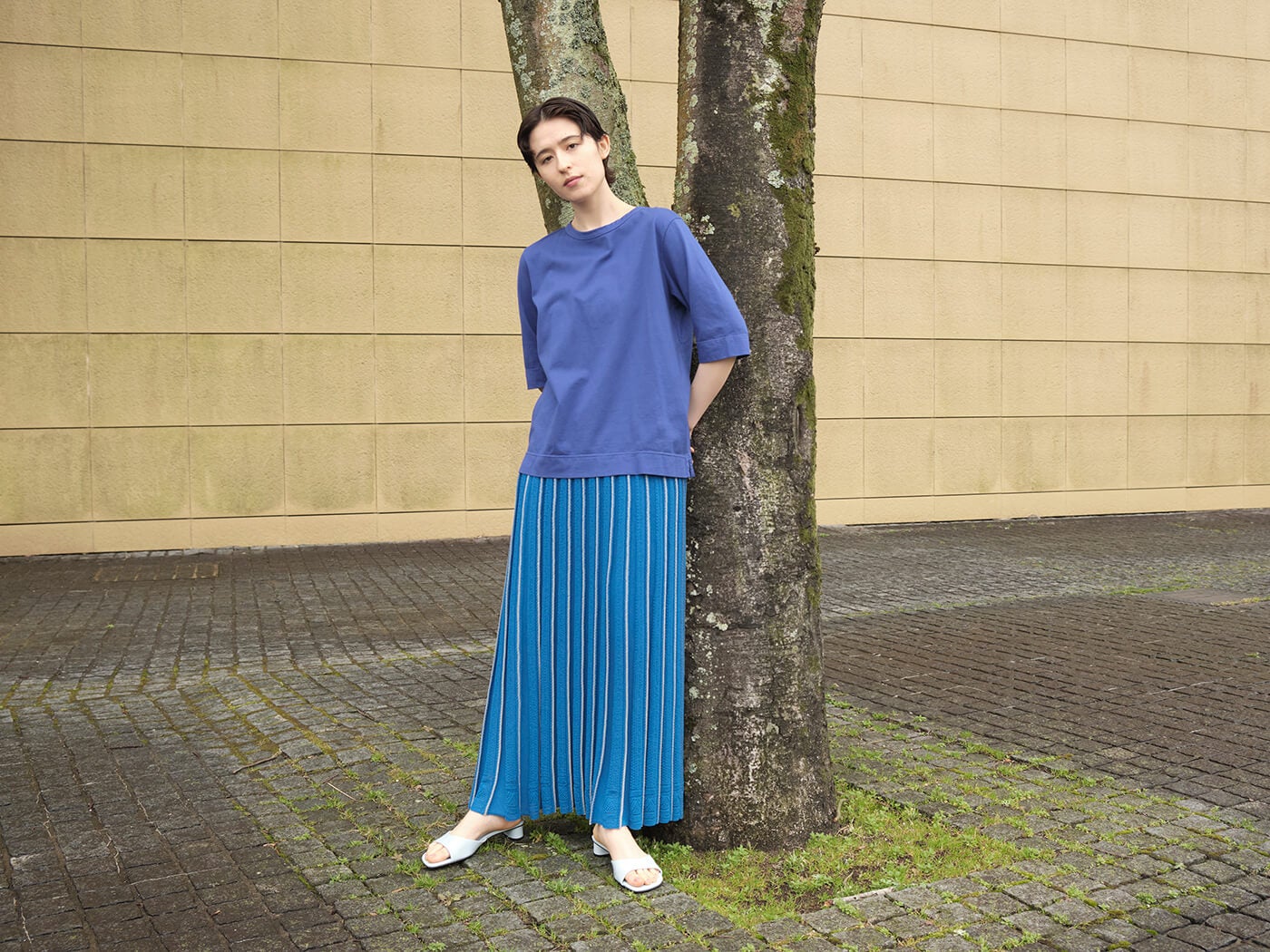 「鮮やかなブルーのTシャツは、ボーイッシュなイメージになりやすいので、
