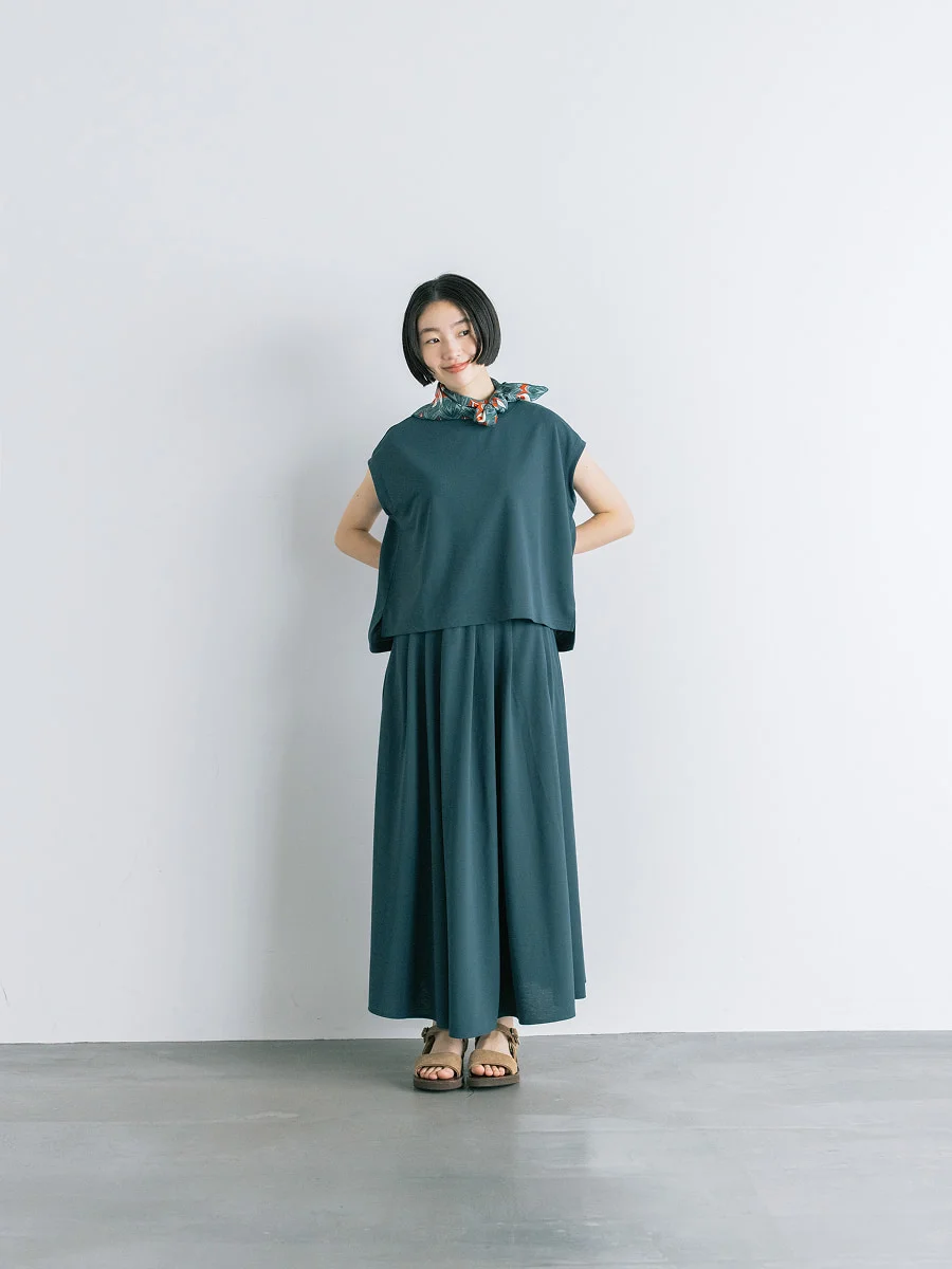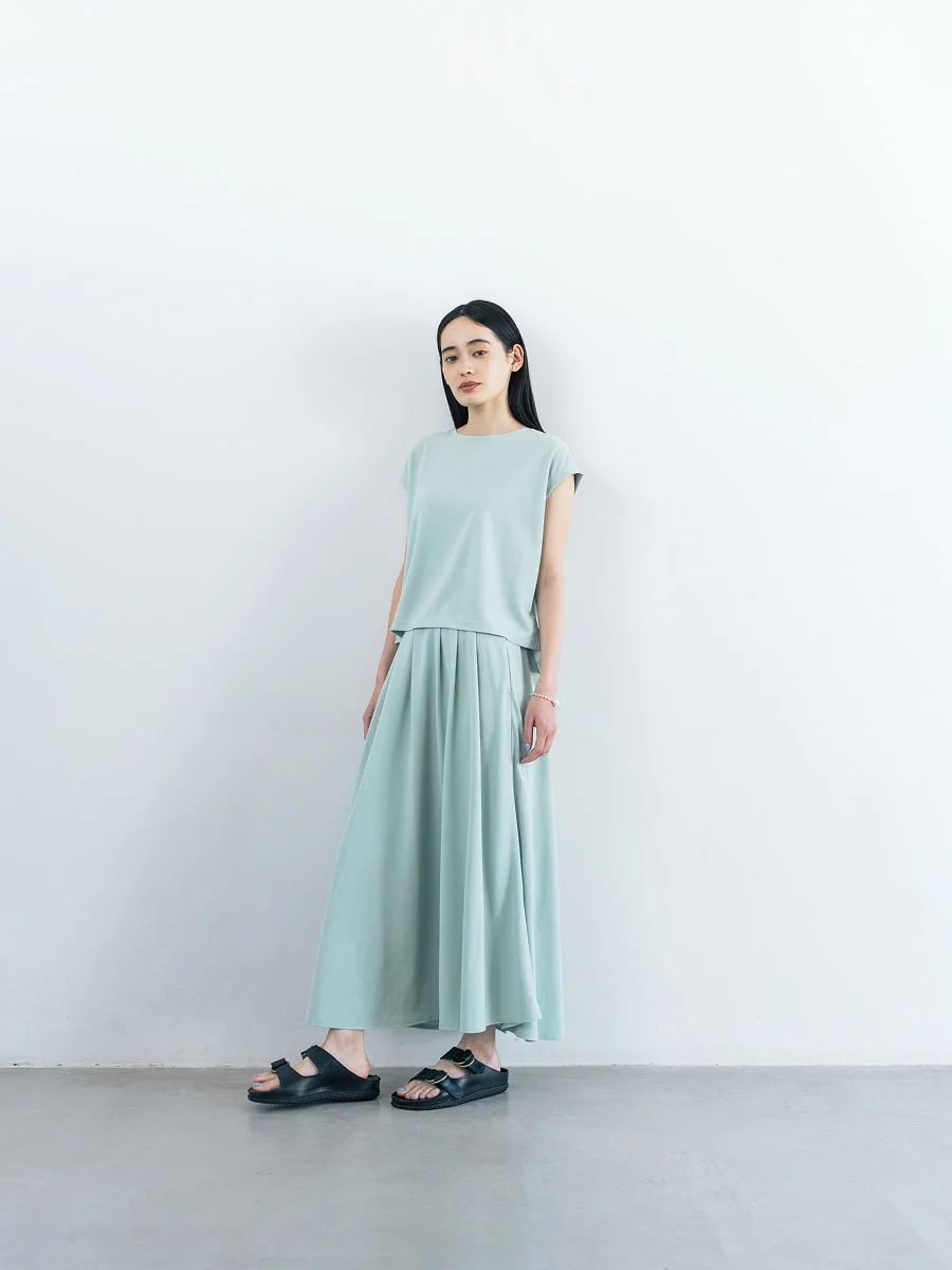 末永 細い方だったらきゅっと締めればいいしね。 フロントのタックがあることで、 ドレープがきれいにでます。 後ろはギャザーたっぷりなので 大柄な方でも問題なく穿いていただけると思います。