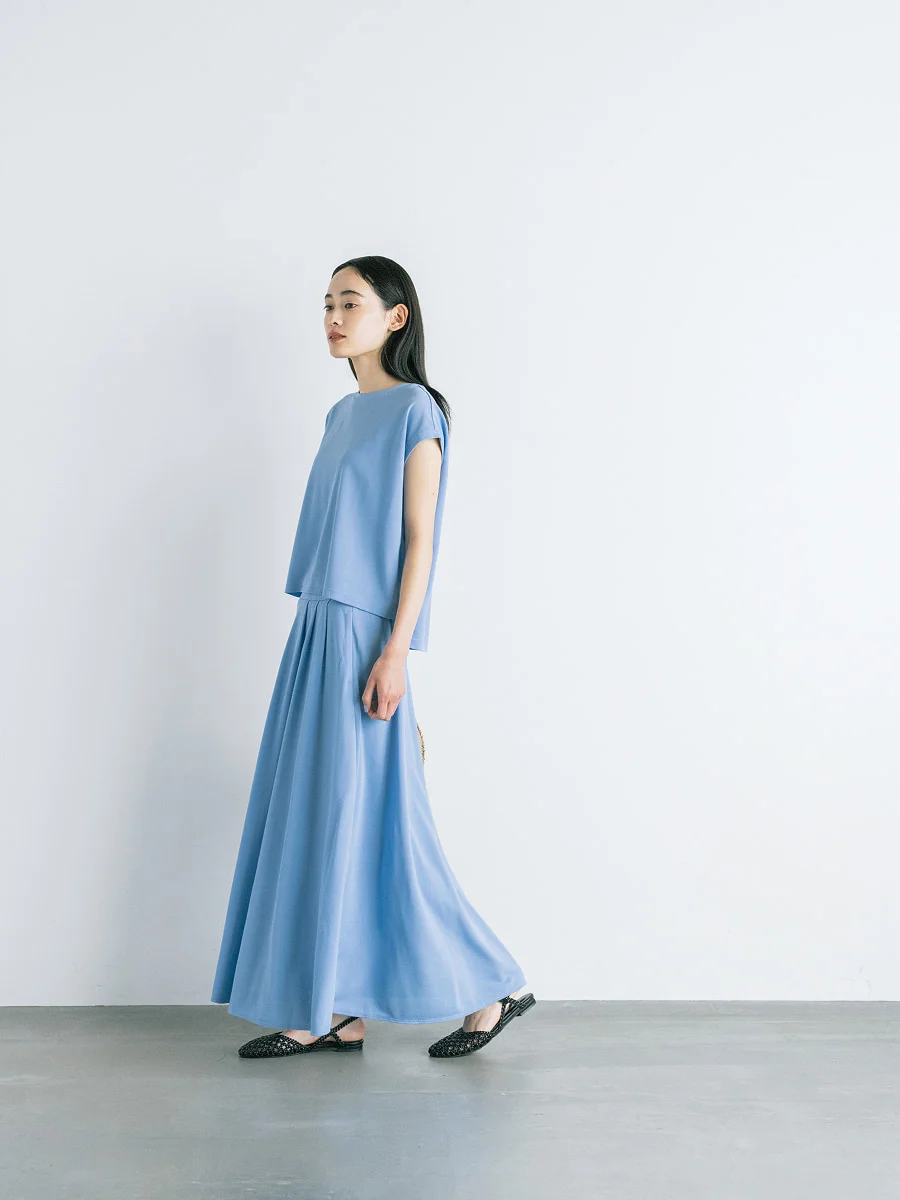 ―― ツーピースがはじめて登場したのが、 ちょうど5年前の2020年。 鹿の子編みのツーピースはたいへんご好評いただいて、 翌年も色を変えてお届けしました。 2023年にはあたらしい生地で、 デザインも変えて発売しました。