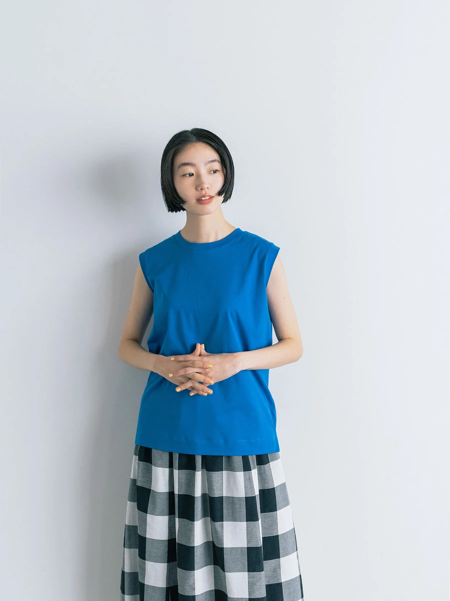 ―― まさに! 夏になるとサロペットをよく着るんですが、 中がTシャツだと子どもっぽくなりすぎてしまって、 おとなっぽく着られる こんなノースリーブがほしかったんです。 ぜひおすすめしたいですね!