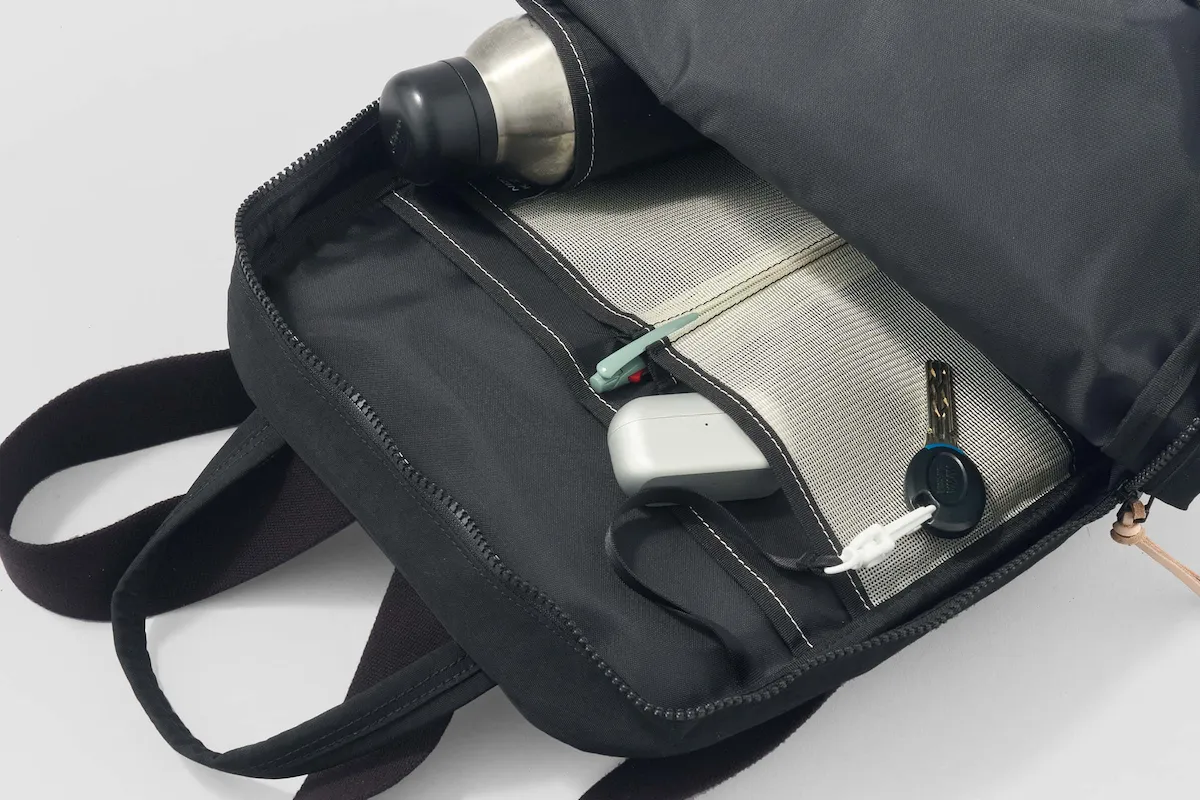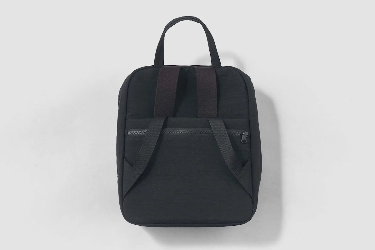 ―― リュックとハンドバッグの 2WAYで使えるような感じですね! わたしはMサイズをほぼ毎日使っているんですが、 Sサイズにも、いつも入れているノートパソコンやお財布、 ポーチ、飲み物が問題なく入りました。 とくに飲み物はホルダーがあってべんり!
